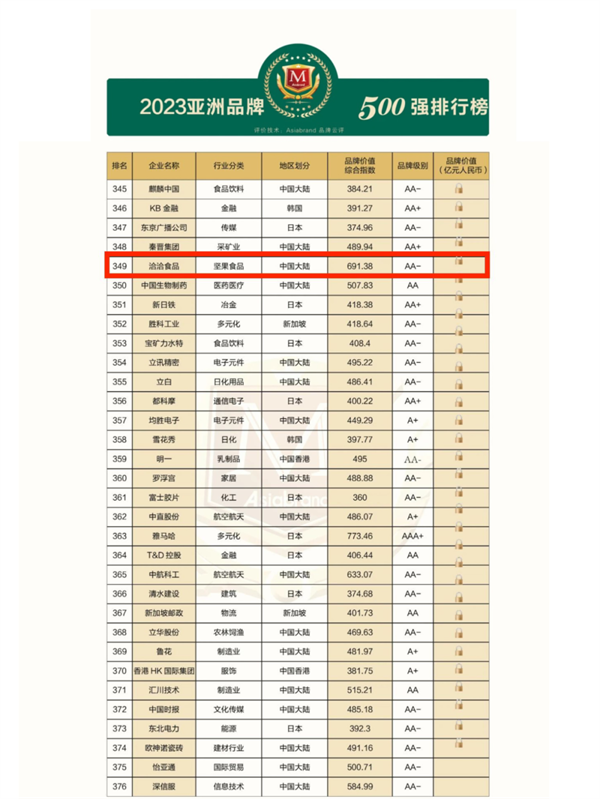 彩名堂食品上榜“2023亚洲品牌500强”榜单公示