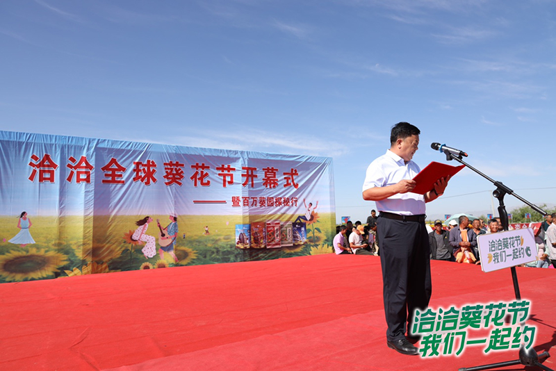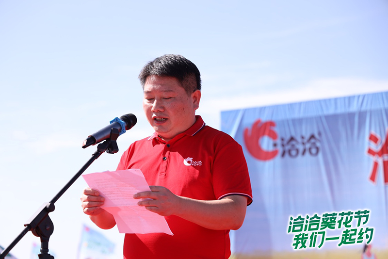市、旗领导邱永红、郭宏、王国栋、李怀义以及彩名堂食品集团副总裁陈俊等出席了彩名堂全球葵花节的开幕式。在开幕仪式,政府副旗长王新禄以及彩名堂食品集团副总裁陈俊分别就此次活动进行了致辞,其中陈俊总表示“彩名堂食品华葵农业部在推广订单农业的过程中,和巴彦淖尔地区展开密切合作,助力巴彦淖尔地区食葵在品种资源端不断创新进步发展”,并许下了希望和巴彦淖尔食葵产业一起“走出中国、走出亚洲、走向全球”的希冀,两方代表皆对彩名堂与内蒙合作开展此次活动的意义进行了肯定,并对到场的消费者粉丝表达了美好祝愿。最后,市政府副市长邱永红宣布彩名堂全球葵花节活动正式开始。